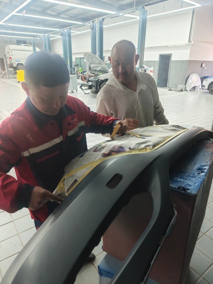 徒弟手中拿著工具,正仔細(xì)地在汽車部件上張貼遮蔽報(bào)紙。何錫忠微微俯身,眼神里滿是認(rèn)真與耐心,他輕聲說道:“張貼遮蔽報(bào)紙時(shí),邊緣一定要貼合緊密,不能有縫隙,不然噴漆時(shí)會(huì)出現(xiàn)瑕疵。” 徒弟頻頻點(diǎn)頭,眼神中透著對(duì)知識(shí)的渴望。