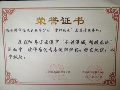 日前,連汽出租公司“雷鋒的士”車隊被共青團連云港市委員會、連云港市志愿者協(xié)會聯(lián)合授予2014年連云港市優(yōu)秀春運組織獎,趙亮、葛劉園、吉錦慧、趙俊哲4人被授予連云港市“和諧港城