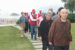 老人們在“黨員的士”志愿者的攙扶下穿過綠陰緩緩步入在海一方公園,踏著柔軟的細沙,伴隨著海潮深深地被大自然的海景所吸引。龔鳳霞老人說:“現(xiàn)在我站在海邊就如做夢一樣,雖然我在連云港生活了這么多年,來海邊看海還真是第一次,以前只是在電視上看過大海,今天我看著海潮、聽著海浪在好心人的陪伴下我真的感到很知足!闭f著說著她不由自主地唱起了“大海啊,故鄉(xiāng)”這支歌,在她的帶動下老人們都附和著唱了起來,臉上流露出童真般的笑容。