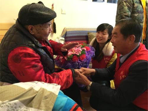 今年已101歲的孫玉林老人早年參加革命,經(jīng)歷了抗日戰(zhàn)爭等重大戰(zhàn)役,現(xiàn)在家安度晚年。上午9時,老人在見到 “黨員的士”志愿者時顯得格外激動,緊緊地握住志愿者的手說“謝謝你們來看望我、陪我聊天”,說著說著就講起了自己的抗戰(zhàn)史并背起了毛澤東詩詞“沁園春雪”。讓志愿者們敬佩不已。
