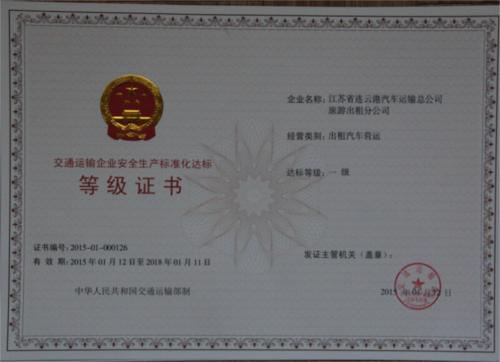 近日,交通運(yùn)輸部正式向江蘇省連云港汽車運(yùn)輸總公司旅游出租分公司(簡(jiǎn)稱連汽出租公司)頒發(fā)了“交通運(yùn)輸企業(yè)安全生產(chǎn)標(biāo)準(zhǔn)化‘出租汽車客運(yùn)’一級(jí)達(dá)標(biāo)證書(shū)”。 據(jù)了解,國(guó)家安全生產(chǎn)標(biāo)準(zhǔn)化企業(yè)分國(guó)家一級(jí)、國(guó)家二級(jí)和國(guó)家三級(jí),一級(jí)為最高級(jí)。截至目前,連云港市尚未有出租汽車企業(yè)通過(guò)國(guó)家一級(jí)安全生產(chǎn)標(biāo)準(zhǔn)化企業(yè)。
