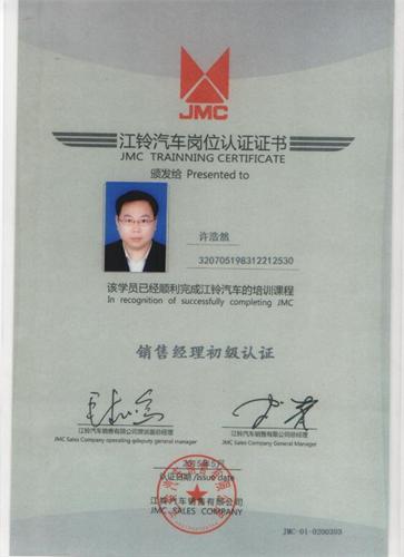 知識。培訓(xùn)最后,江鈴公司對所有參訓(xùn)人員進(jìn)行筆試,修理公司許浩然順利通過認(rèn)證培訓(xùn)并拿到了江鈴銷售經(jīng)理初級認(rèn)證證書。